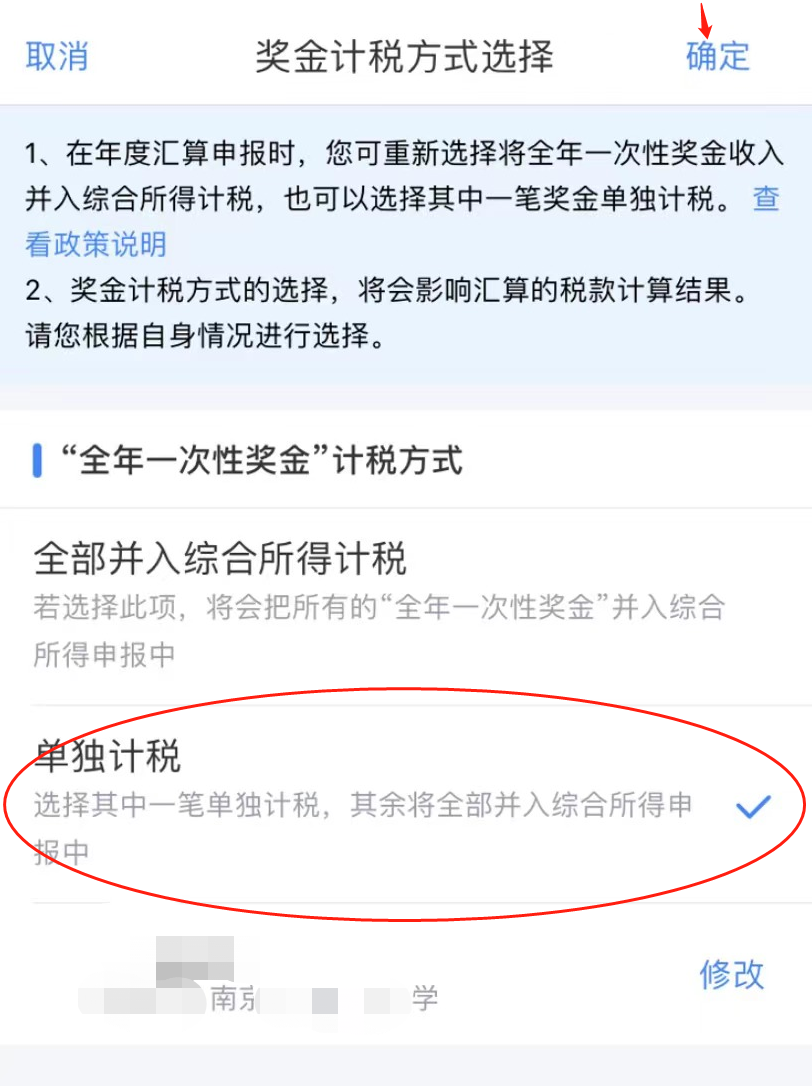 点击“工资薪金”-“全年一次性奖金”计税方式有“全部并入综合所得计税”和“单独计税”两种,可以分别试算后,返回申报页面,选最优方式。