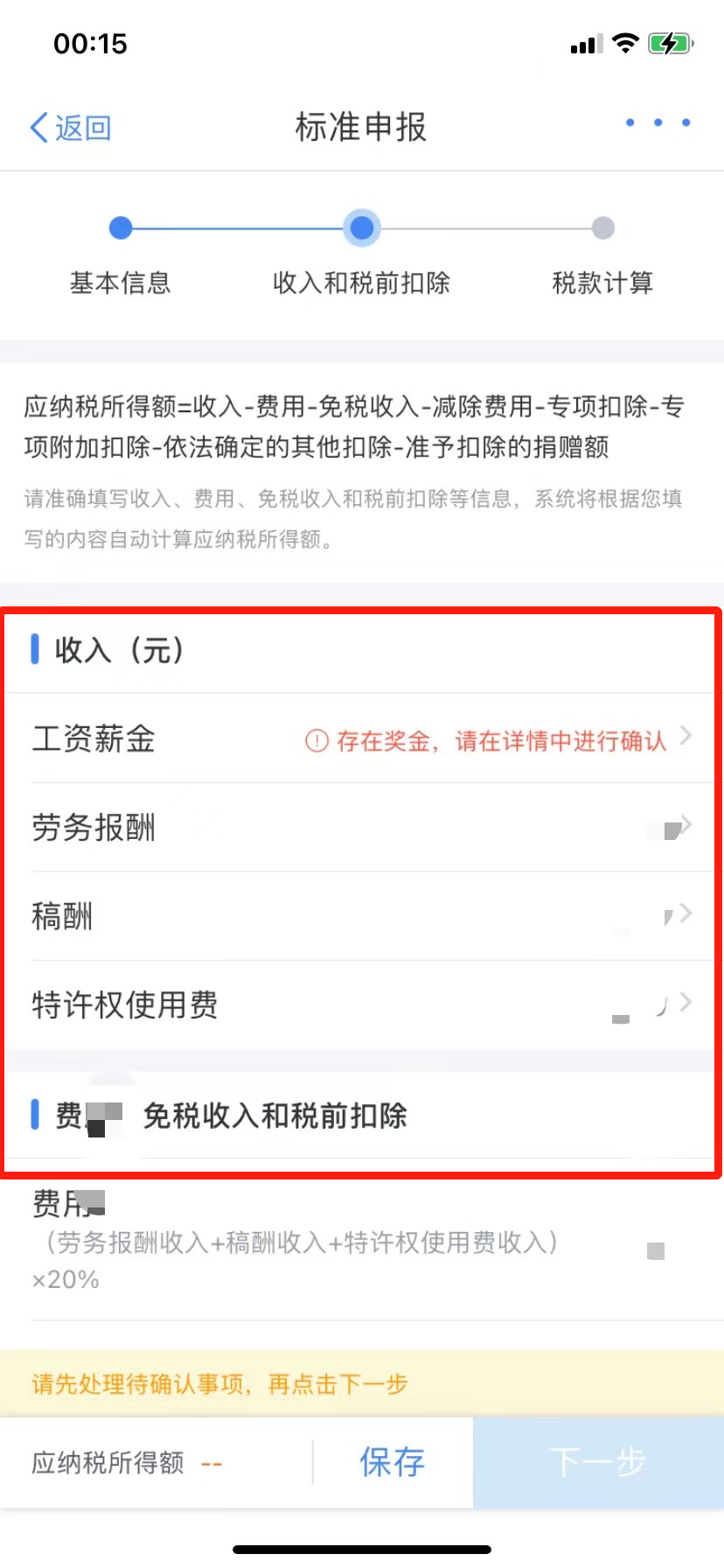 (六)查看“收入和税前扣除”信息,包括工资薪金、劳务报酬、稿酬和特许权使用费,点击最后的箭头可查看每种收入的明细。