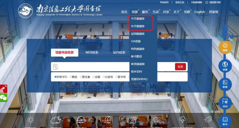 3、点击“图书馆”进入图书馆门户网站,选择相关数据库直接访问。