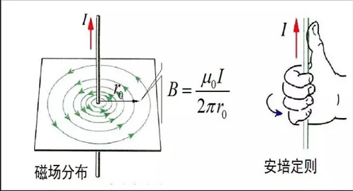 先从电感说起,电与磁是物理学中一个重要的部分,我们从初中物理就开始接触电磁场,书的开篇就是奥斯特电磁实验,在这个实验中,奥斯特向我们揭示了通电导体周围存在着和永磁铁一样的磁场,并打开了人们探索电与磁关系的大门。我们还可以通过安培定则来确定导体周围电磁线的分布情况。