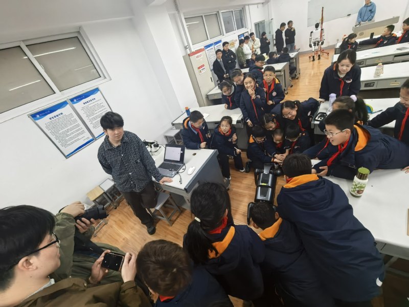 在科普基地老师杨扬、韦中的组织与带领下,师生们有序参观了机器人实验室及相关展示区域。研究生志愿者张天乐、殷吉鹏、李博、卞程、张乔森、杨梦婷为同学们进行了细致生动的讲解与演示,带领大家深入了解机器人技术的发展现状与应用前景。
